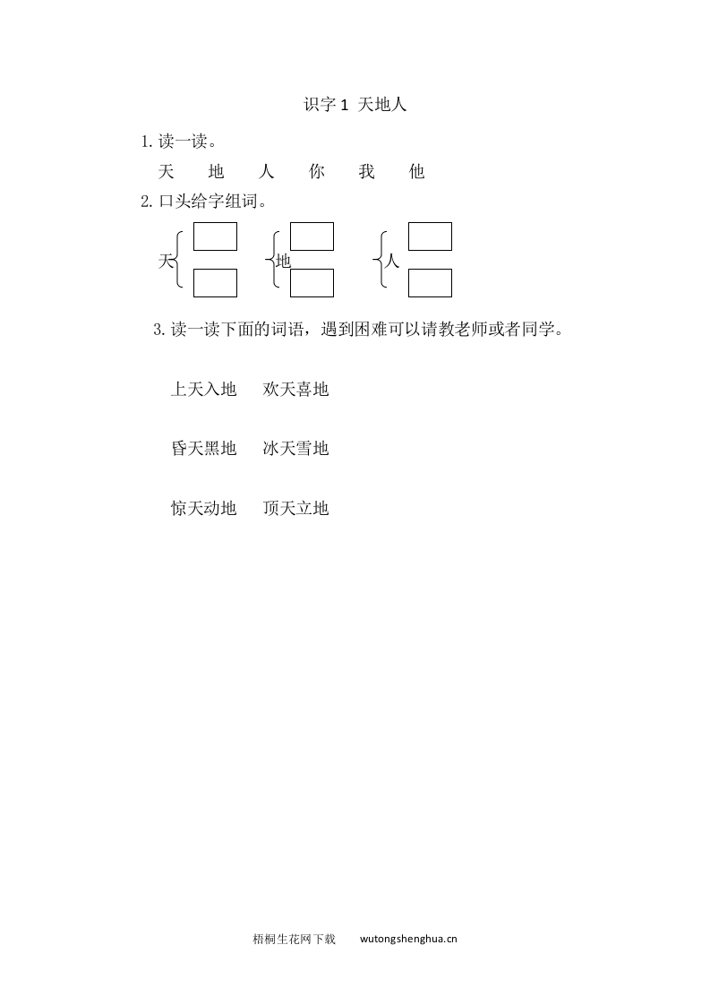 2021部编版一年级语文上册第一单元课堂练习题及答案-识字1天地人课时练qweryou25年10月20日发布关注私信13.50KB2页07510 第1页 / 共2页 该文档为免费文档,您可直接下载完整版进行阅读 © 版权声明文章版权归作者所有,转载请注明来源,未经允许请勿转载。本站内容均来自用户投稿或网络公开收集,本站只做展示,不对内容真实性负责。THE END文库文档 文本预览 识字1天地人1.读一读。天地人你我他2.口头给字组词。把把把3.读一读下面的词语,遇到困难可以请教老师或者同学。上天入地欢天喜地昏天黑地冰天雪地惊天动地顶天立地梧桐生花网下载wutongshenghua.cn 查看更多 收起部分 喜欢就支持一下吧点赞10 分享QQ空间微博QQ好友海报分享复制链接收藏