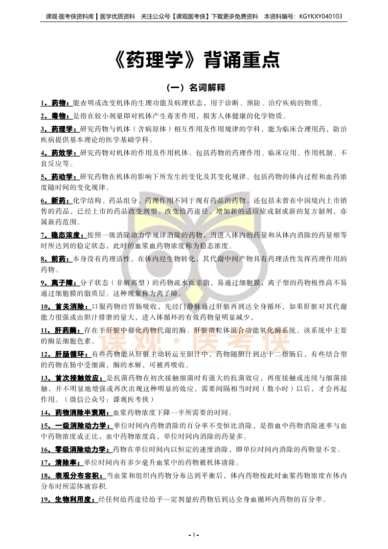 课观医考侠资料库医学优质资料关注公众号【课观医考侠】下载更多免费资料本资料编号:KGYKXY040103《药理学》背诵重点(一)名词解释,药物:能查明或改变机体的生理功能及病理状态,用于诊断、预防、治疗疾病的物质。2,毒物:是指在较小剂量即对机体产生毒害作用,损害人体健康的化学物质。3。药理学:研究药物与机体(含病原体)相互作用及作用规律的学科,能为临床合理用药,防治疾病提供基本理论的医学基础学科。4,药效学:研究药物对机体的作用及作用机体。包括药物的药理作用、临床应用、作用机制、不良反应等。5。药动学:研究药物在机体的影响下所发生的变化及其变化规律。包括药物的体内过程和血药浓度随时间的变化规律。6,新药:化学结构、药品组分、药理作用不同于现有药品的药物。还包括未曾在中国境内上市销售的药品,已经上市的药品改变剂型、改变给药途径、增加新的适应症或制成新的复方制剂,亦属新药范围。?,稳态浓度:按照一级消除动力学规律消除的药物,当进人体内的药量和从体内消除的药量相等时所达到的稳定状态,此时的血浆血药物浓度称为稳态浓度。8。前药:本身没有药理活性,在体内经生物转化,其代谢中间产物具有药理活性发挥药理作用的药物。9,离子健:分子状态(非解离型)的药物疏水而亲脂,易通过细胞膜,离子型的药物极性高不易通过细胞膜的脂质层。这种现象称为离子障。10,首关逍除:口服药物经胃肠吸收,先经门静脉通过肝脏再到达全身循环,如果肝脏对其代谢能力很强或由胆汁排泄的量大,进人体循环的有效药物量明显减少,山,肝药酶:存在于肝脏中催化药物代谢的酶。肝脏微粒体混合功能氧化酶系统,该系统中主要的酶是细胞色素。片●12,肝肠循还:有些药物能从肝脏主动转运至胆汁中,药物随胆汁到达十二指肠后,有些结合型的药物在肠中受细菌,酶的水解,可被再吸收。13,首次接触效应:是抗菌药物在初次接触细菌时有强大的抗菌效应,再度接触或连续与细菌接触,并不明显地增强或再次出现这种明显的效应,需要间隔相当时间(数小时)以后,才会再起作用。(微信公众号:课观医考侠)14.药物消除半麦期:血浆药物浓度下降一半所需要的时间。15。一级消除劲力学:单位时间内药物消除的百分率不变恒比消除,是指血中药物消除速率与血中药物浓度成正比,血中药物浓度高,单位时间内消除的药量多。16,零级消除动力学:药物在单位时间内以恒定的速度消除,即单位时间内消除的药物量不变。17,清除率:单位时间内有多少毫升血浆中的药物被机体清除。18。表观分布容积:当血浆和组织内药物分布达到平衡后,体内药物按此时血浆药物浓度在体内分布时所需体液容积。19,生物利用度:经任何给药途径给予一定剂量的药物后到达全身血循环内药物的百分率。1-