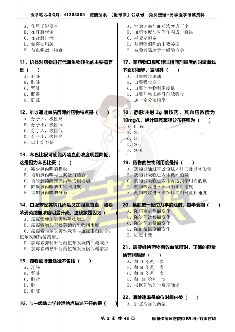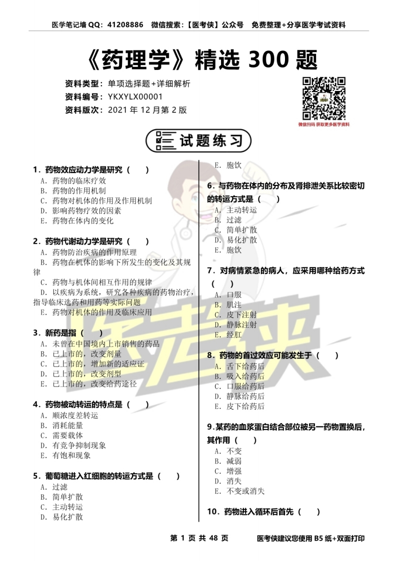 医学笔记墙QQ:41208886微信搜索:【医考侠】公众号免费整理+分享医学考试资料《药理学》精选300题资料类型:单项选择题+详细解析回▣资料编号:YKXYLX00001资料版次:2021年12月第2版微信扫码获取更多医学资料三试题练习1.药物效应动力学是研究()E.胞饮A.药物的临床疗效B.药物的作用机制6,与药物在体内的分布及肾排泄关系比较密切C.药物对机体的作用及作用机制的转运方式是()D.影响药物疗效的因素一A.主动转运E.药物在体内的变化B.过滤c.简单扩散2.药物代谢动力学是研究(D.易化扩散A.药物防治疾病的作用原理E.胞饮B.药物在机体的影响下所发生的变化及其规律7,对病情紧急的病人,应采用哪种给药方式C.药物与机体间相互作用的规律()D.以疾病为系统,研究各种疾病的药物治疗,A.口服指导临床选药和用药等实际问题B.肌注E.药物对机体的作用及临床应用C.皮下注射D.静脉注射3.新药是指()E,经肛A.未曾在中国境内上市销售的药品B.己上市的,改变剂量8.药物的首过效应可能发生于()C.己上市的,增加新的适应证A.舌下给药后D.已上市的,改变剂型B.吸入给药后E.已上市的,改变给药途径C.口服给药后D.静脉给药后4.药物被动转运的特点是(E.皮下给药后A.顺浓度差转运B.消耗能量9.某药的血浆蛋白结合部位被另一药物置换后,C.需要载体D.有竞争抑制现象其作用()E.有饱和现象A.不变B.减弱C.增强5.葡萄糖进入红细胞的转运方式是()D.消失A.过滤E.不变或消失B.简单扩散C.主动转运D.易化扩散10.药物进入循环后首先()第1页共48页医考侠建议您使用B5纸+双面打印