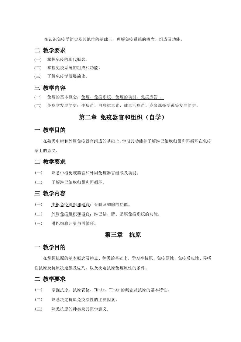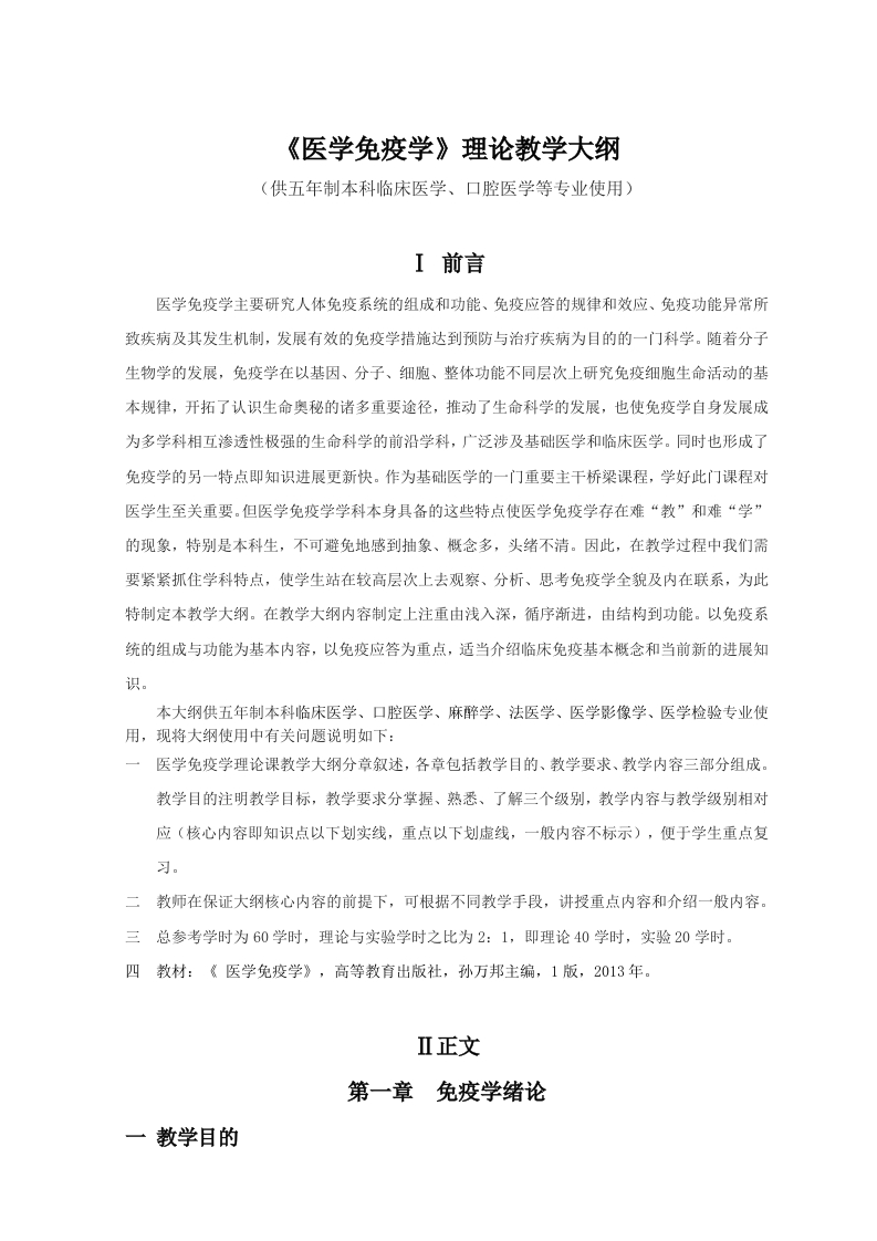 《医学免疫学》理论教学大纲(供五年制本科临床医学、口腔医学等专业使用)I前言医学免疫学主要研究人体免疫系统的组成和功能、免疫应答的规律和效应、免疫功能异常所致疾病及其发生机制,发展有效的免疫学措施达到预防与治疗疾病为目的的一门科学。随着分子生物学的发展,免疫学在以基因、分子、细胞、整体功能不同层次上研究免疫细胞生命活动的基本规律,开拓了认识生命奥秘的诸多重要途径,推动了生命科学的发展,也使免疫学自身发展成为多学科相互渗透性极强的生命科学的前沿学科,广泛涉及基础医学和临床医学。同时也形成了免疫学的另一特点即知识进展更新快。作为基础医学的一门重要主干桥梁课程,学好此门课程对医学生至关重要。但医学免疫学学科本身具备的这些特点使医学免疫学存在难“教”和难“学”的现象,特别是本科生,不可避免地感到抽象、概念多,头绪不清。因此,在教学过程中我们需要紧紧抓住学科特点,使学生站在较高层次上去观察、分析、思考免疫学全貌及内在联系,为此特制定本教学大纲。在教学大纲内容制定上注重由浅入深,循序渐进,由结构到功能。以免疫系统的组成与功能为基本内容,以免疫应答为重点,适当介绍临床免疫基本概念和当前新的进展知识。本大纲供五年制本科临床医学、口腔医学、麻醉学、法医学、医学影像学、医学检验专业使用,现将大纲使用中有关问题说明如下:一医学免疫学理论课教学大纲分章叙述,各章包括教学目的、教学要求、教学内容三部分组成。教学目的注明教学目标,教学要求分草握、熟悉、了解三个级别,教学内容与教学级别相对应(核心内容即知识点以下划实线,重点以下划虚线,一般内容不标示),便于学生重点复习。二教师在保证大纲核心内容的前提下,可根据不同教学手段,讲授重点内容和介绍一般内容。三总参考学时为60学时,理论与实验学时之比为2:1,即理论40学时,实验20学时。四教材:《医学免疫学》,高等教育出版社,孙万邦主编,1版,2013年。Ⅱ正文第一章免疫学绪论一教学目的