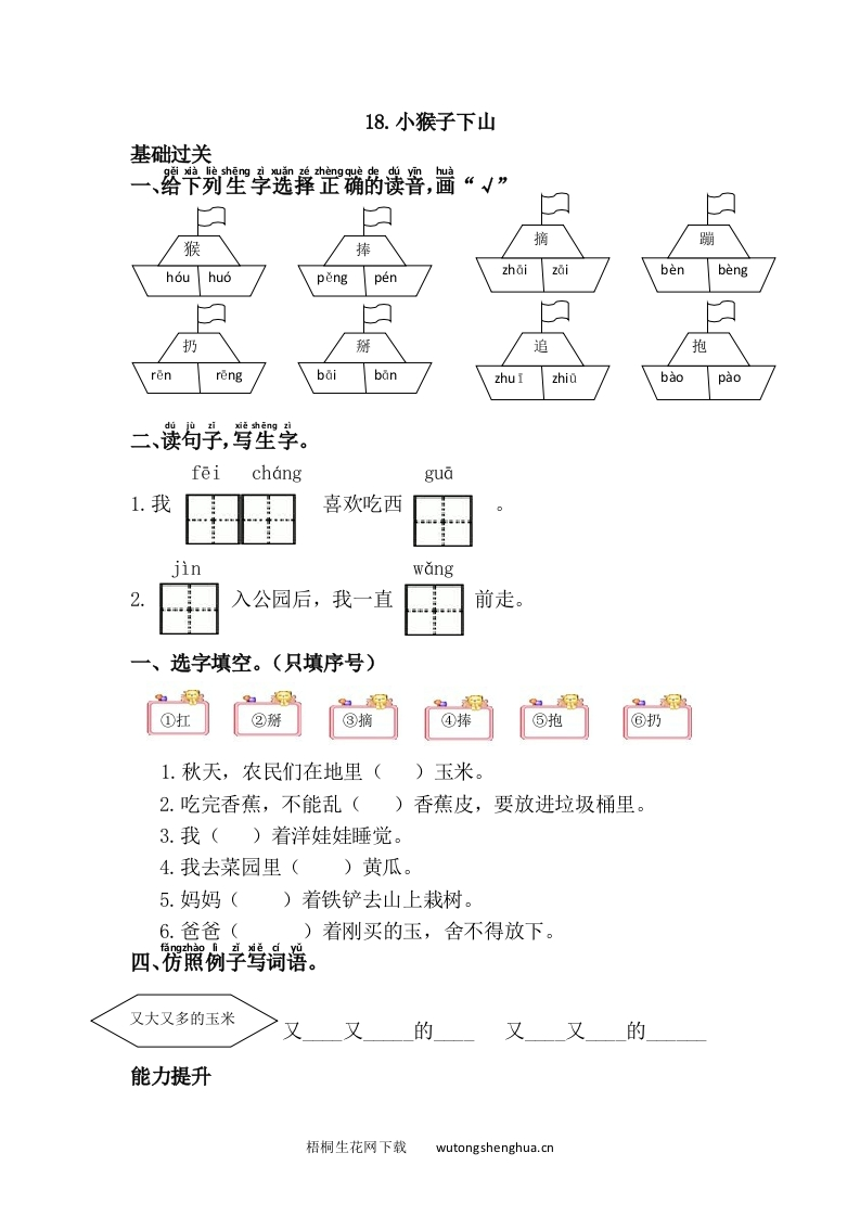 18.小猴子下山基础过关、路平列笙学迷彝罡蹦酯姜署,間“√”猴捧摘蹦houhuopěngzhaizaipenbenbeng扔掰追抱renrengbaibanzhu Izhiabaopao二、读句学,号生字。feichanggua1.我喜欢吃西jinwang2入公园后,我一直前走。一、选字填空。(只填序号)①扛②掰③摘④捧⑤抱⑥扔1.秋天,农民们在地里()玉米。2.吃完香蕉,不能乱()香蕉皮,要放进垃圾桶里。3.我()着洋娃娃睡觉。4.我去菜园里()黄瓜。5.妈妈()着铁铲去山上栽树。6.爸爸()着刚买的玉,舍不得放下。四、楞照例学驾词器。又大又多的玉米的又又的能力提升梧桐生花网下载wutongshenghua.cn