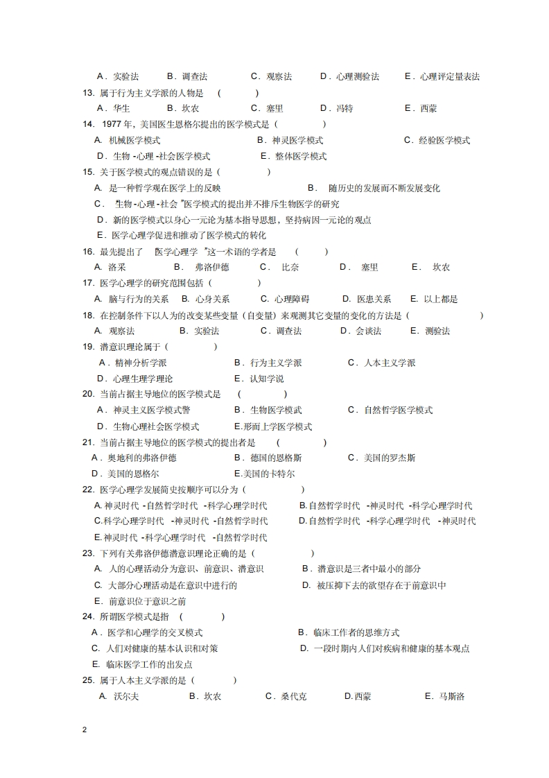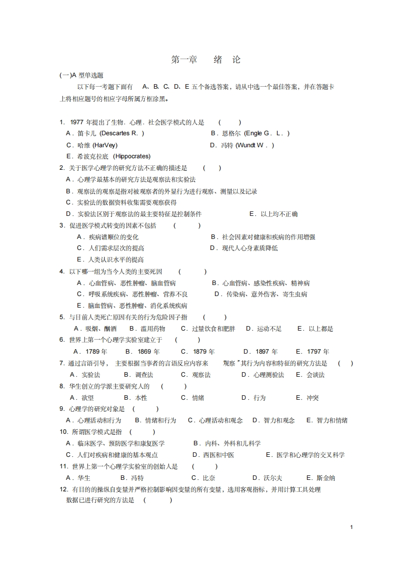 第一章绪论(一)A型单选题以下每一考题下面有A、BC、D、E五个备选答案,请从中选一个最佳答案,并在答题卡上将相应题号的相应字母所属方框涂黑。1.1977年提出了生物.心理.社会医学模式的人是()A.笛卡儿(Descartes R.)B.恩格尔(Engle G.L.)C.哈维(HarVey)D.冯特(Vundt W.)E.希波克拉底(Hippocrates)2.关于医学心理学的研究方法不正确的描述是(A.心理学最基本的研究方法是观察法和实验法B,观察法的观察是指对被观察者的外显行为进行观察、测量以及记录C.实验法的数据资料收集需要观察获得D.实验法区别于观察法的最主要特征是控制条件E.以上均不正确3.促进医学模式转变的因素不包括(A.疾病谱顺位的变化B.社会因素对健康和疾病的作用增强C.人们需求层次的提高D.现代人心身素质降低E.人类认识水平的提高4.以下哪一组为当今人类的主要死因A.心血管病、恶性肿瘤、脑血管病B.心血管病、感染性疾病、精神病C.呼吸系统疾病、恶性肿瘤、营养不良D.传染病、意外伤害、寄生虫病E.脑血管病、恶性肿瘤、消化系统疾病5.与目前人类死亡原因有关的行为危险因子指A.吸烟、酗酒B.滥用药物C.过量饮食和肥胖D.运动不足E.以上都是6.世界上第一个心理学实验室建立于()A.1789年B.1869年C.1879年D.1897年E.1797年7.通过言语引导,主要根据当事者的言语反应内容来规察”其行为内容和特征的研究方法是()A.实验法B.调查法C.观察法D.心理测验法E.会谈法8.华生创立的学派主要研究人的(A.欲望B.本性C.情绪D.行为E.冲突9.心理学的研究对象是()A.心理活动和行为B.情绪和行为C.心理活动和观念D.智力和观念E.智力和情绪10.所谓医学模式是指()A.临床医学、预防医学和康复医学B.内科、外科和儿科学C.人们对疾病和健康的基本观点D.西医和中医E.医学和心理学的交叉科学11.世界上第一个心理学实验室的创始人是A.华生B.冯特C.比奈D.沃尔夫E.斯金纳12.有目的的操纵自变量并严格控制影响因变量的所有变量,选用客观指标,并用计算工具处理数据已进行研究的方法是(1