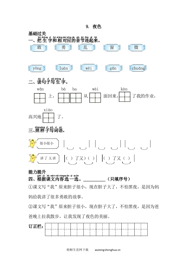 9.夜色基础过一、把星里学箱霜射逻崩普逢起果。敢勇乱等窗微yǒngluan·Aweiganchuangs二、姜局学鹭笙学。wanbabawàikan面回来了我的作业,xiào高兴地了三、臏祥孚鹭词谣。很小很小I1I川讲了又讲9IRe1能力提升四、粮据课安丙容选“选。(只填序号)①课文写“我”原来胆子很小,现在胆子大了,不怕黑夜,是因为妈妈给我讲了很多勇敢的故事。②课文写“我”原来胆子很小,现在胆子大了,不怕黑夜,是因为爸爸晚上拉我散步,让我发现了夜色的美丽。订正栏:梧桐生花网下载wutongshenghua.cn