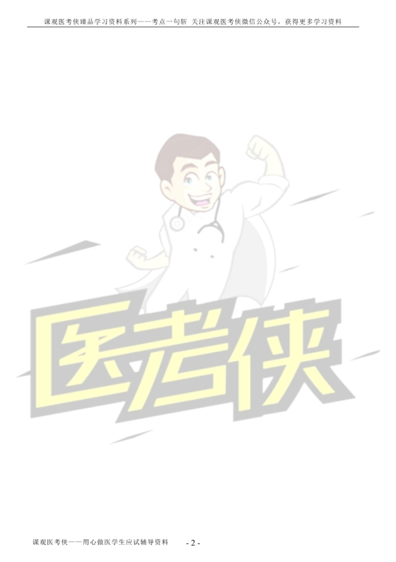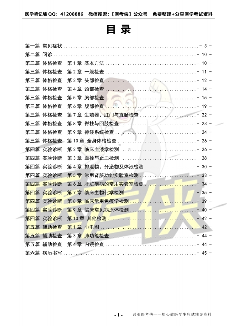 医学笔记墙QQ:41208886微信搜索:【医考侠】公众号免费整理+分享医学考试资料目录第一篇常见症状3-第二篇问诊。。。。。。。。。。。。。。。44g4444。,。,。=第三篇体格检查第1章基本方法一10-第三篇体格检查第2章一般检查11-第三篇体格检查第3章头部检查第三篇体格检查第4章颈部检查第三篇体格检查第5章胸部检查15-第三篇体格检查第6章腹部检查-19第三篇体格检查第7章生殖器、肛门与直肠检查22-第三篇体格检查第8章脊柱与四肢检查23-第三篇体格检查第9章神经系统检查..-24-第三篇体格检查第10章全身体格检查26-第四篇实验诊断第2章临床血液学检测26-第四篇实验诊断第3章血栓与止血检测28-第四篇实验诊断第4章排泄物、分泌物及体液检测...-30-第四篇实验诊断第5章常用肾脏功能实验室检测33-第四篇实验诊断第6章肝脏疾病的常用实验室检测34-第四篇实验诊断第7章临床生物化学检测.·.·35-第四篇实验诊断第8章临床常用免疫学检测·,...·.···39第四篇实验诊断第9章临床常见病原体检测40第四篇实验诊断第10章其他检测42第五篇辅助检查第1章心电图42-第五篇辅助检查第3章肺功能检查44第五篇辅助检查第4章内镜检查44-第六篇病历书写-45--1-课观医考侠一一用心做医学生应试辅导资料