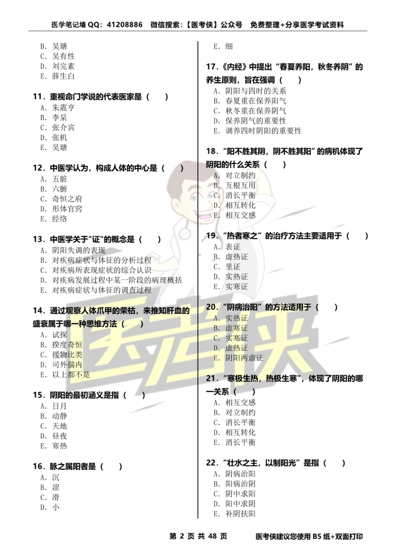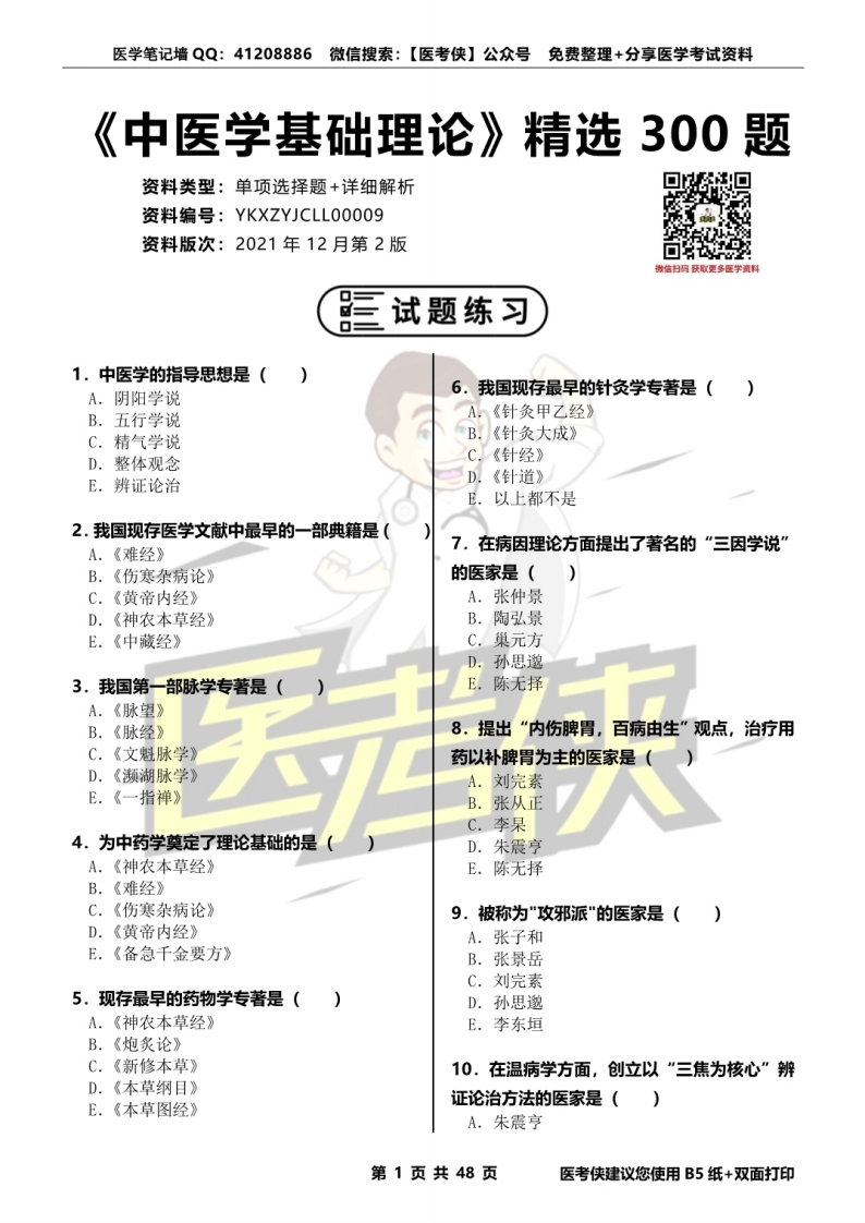 医学笔记墙QQ:41208886微信搜索:【医考侠】公众号免费整理+分享医学考试资料《中医学基础理论》精选300题资料类型:单项选择题+详细解析资料编号:YKXZYJCLL00009资料版次:2021年12月第2版微信扫码获取更多医学资E试题练习■1.中医学的指导思想是()A.阴阳学说6。我国现存最早的针灸学专著是()B.五行学说A.《针灸甲乙经》C.精气学说B.《针灸大成》D.整体观念C.《针经》E.辨证论治D.《针道》E.以上都不是2.我国现存医学文献中最早的一部典籍是(A.《难经》7.在病因理论方面提出了著名的“三因学说”B.《伤寒杂病论》的医家是(C.《黄帝内经》A.张仲景D.《神农本草经》B.陶弘景E.《中藏经》C.巢元方D.孙思邈3.我国第一部脉学专著是()E.陈无择A.《脉望》B.《脉经》8。提出“内伤脾胃,百病由生”观点,治疗用C.《文魁脉学》药以补脾胃为主的医家是(D.《濒湖脉学》A.刘完素E.《一指禅》B.张从正C.李杲4.为中药学奠定了理论基础的是(D.朱震亨A.《神农本草经》E.陈无择B.《难经》C.《伤寒杂病论》9.被称为“攻邪派“的医家是()D.《黄帝内经》A.张子和E.《备急千金要方》B.张景岳C.刘完素5.现存最早的药物学专著是()D.孙思邈A.《神农本草经》E.李东垣B.《炮炙论》C.《新修本草》10.在温病学方面,创立以“三焦为核心”辨D.《本草纲目》E.《本草图经》证论治方法的医家是()A.朱震亨第1页共48页医考侠建议您使用B5纸+双面打印