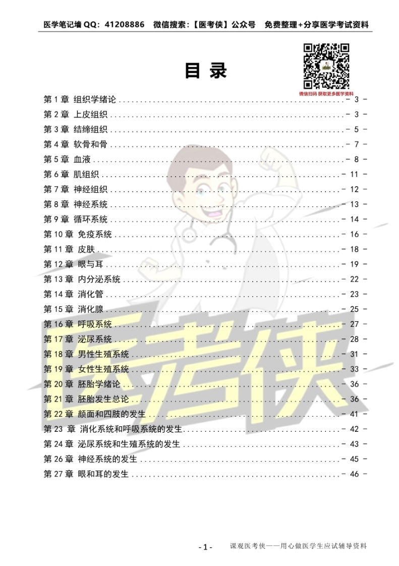 医学笔记墙QQ:41208886微信搜索:【医考侠】公众号免费整理+分享医学考试资料▣▣目录微信扫码获双更多医学黄料第1章组织学绪论第2章上皮组织3-第3章结缔组织5-第4章软骨和骨7-第5章血液8-第6章肌组织….-11第7章神经组织第8章神经系统….-13第9章循环系统第10章免疫系统..-16-第11章皮肤....-18-第12章眼与耳.,…-19第13章内分泌系统22-第14章消化管23-第15章消化腺...……..-25第16章呼吸系统.............-27-第17章泌尿系统28-第18章男性生殖系统31第19章女性生殖系统33第20章胚胎学绪论36第21章胚胎发生总论.·.36-第22章颜面和四肢的发生41第23章消化系统和呼吸系统的发生42-第24章泌尿系统和生殖系统的发生43-第26章神经系统的发生45-第27章眼和耳的发生....-46--1-课观医考侠一一用心做医学生应试辅导资料