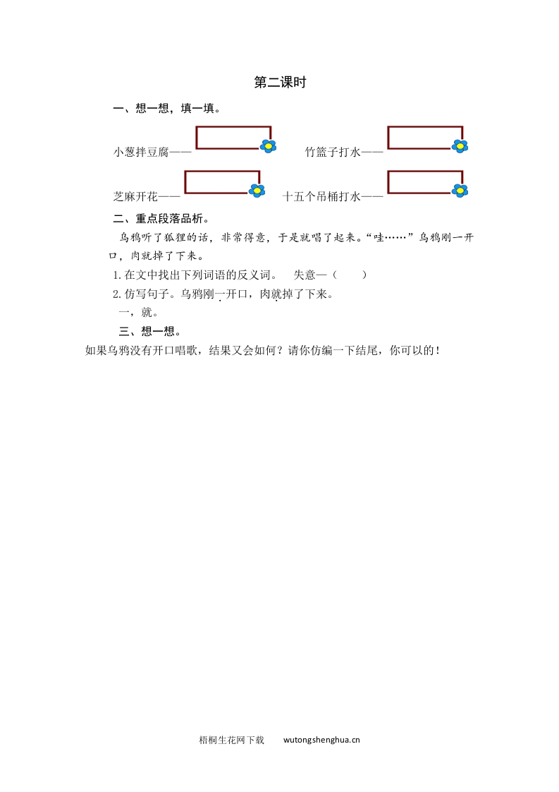 第二课时一、想一想,填一填。小葱拌豆腐竹篮子打水芝麻开花十五个吊桶打水二、重点段落品析。乌鸦听了孤狸的话,非常得意,于是就唱了起来。“哇…”乌鸦刚一开口,肉就掉了下来。1.在文中找出下列词语的反义词。失意一()2.仿写句子。乌鸦刚一开口,肉就掉了下来。一,就。三、想一想。如果乌鸦没有开口唱歌,结果又会如何?请你仿编一下结尾,你可以的!梧桐生花网下载wutongshenghua.cn