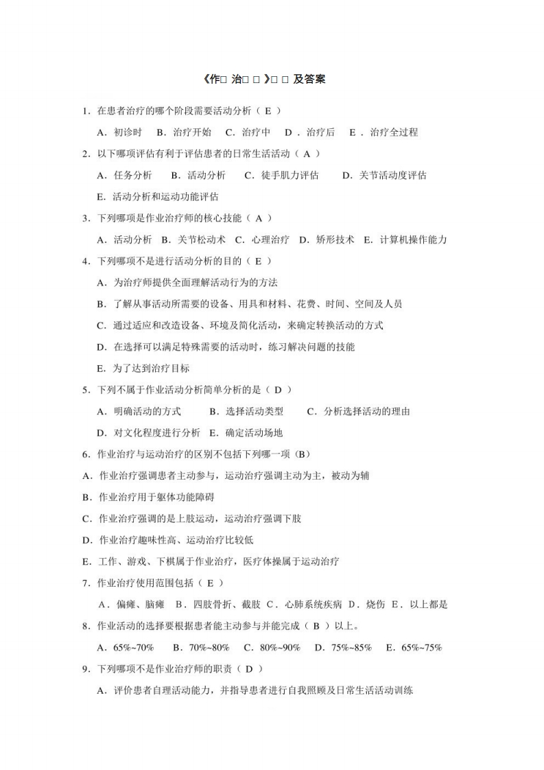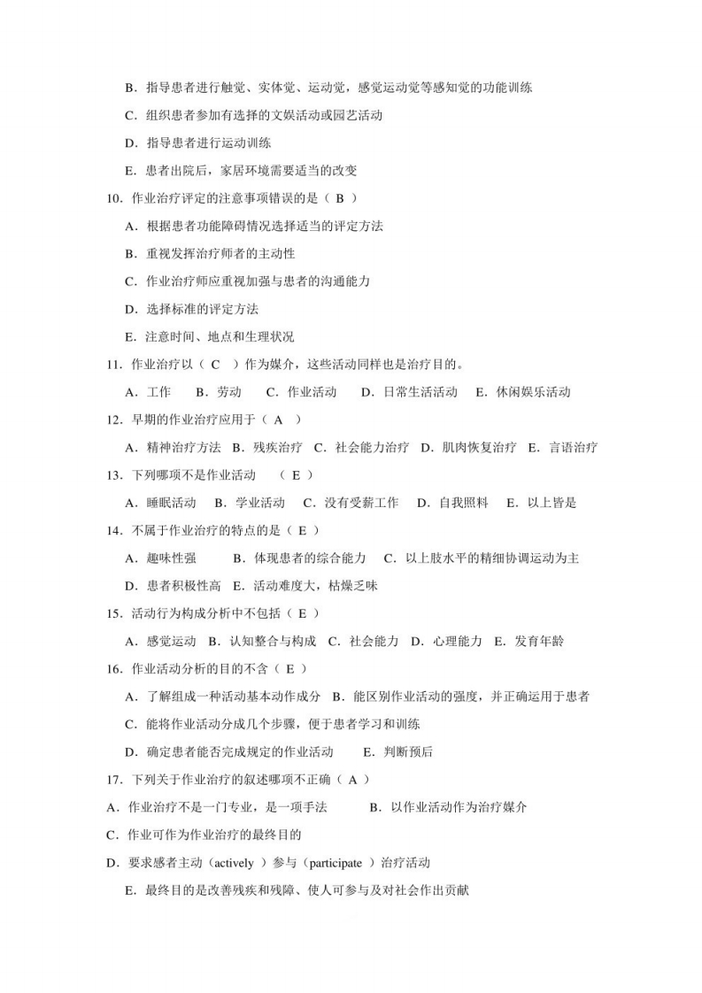 《作和治口口》口口及答案1.在惠者治疗的哪个阶段需要活动分析(E)A,初诊时B.治疗开始C.治疗中D,治疗后E,治疗全过程2.以下哪项评估有利于评估患者的日常生活活动(A)A.任务分析B.活动分析C.徒手肌力评估D.关节活动度评估E.活动分析和运动功能评估3.下列哪项是作业治疗师的核心技能(A)A.活动分析B.关节松动术C.心理治疗D.矫形技术E.计算机操作能力4.下列哪项不是进行活动分析的目的(E)A.为治疗师提供全面理解活动行为的方法B,了解从事活动所需要的设备、用具和材料、花费、时间、空间及人员C,通过适应和改造设备、环境及简化活动,来确定转换活动的方式D。在选择可以满足特殊需要的活动时,练习解决问题的技能E.为了达到治疗目标5.下列不属于作业活动分析简单分析的是(D)A.明确活动的方式B.选择活动类型C.分析选择活动的理由D.对文化程度进行分析E.确定活动场地6.作业治疗与运动治疗的区别不包括下列哪一项(B)A.作业治疗强调患者主动参与,运动治疗强调主动为主,被动为辅B.作业治疗用于躯体功能障碍C.作业治疗强调的是上肢运动,运动治疗强调下肢D.作业治疗趣味性高、运动治疗比较低E.工作、游戏、下棋属于作业治疗,医疗体操属于运动治疗7.作业治疗使用范围包括(E)A,偏瘫、脑瘫B,四肢骨折、截肢C,心肺系统疾病D.烧伤E,以上都是8.作业活动的选择要根据患者能主动参与并能完成(B)以上。A.65%-70%B.70%-80%C.80%-90%D.75%-85%E.65%-75%9.下列哪项不是作业治疗师的职责(D)A,评价患者自理活动能力,并指导患者进行自我照项及日常生活活动训练