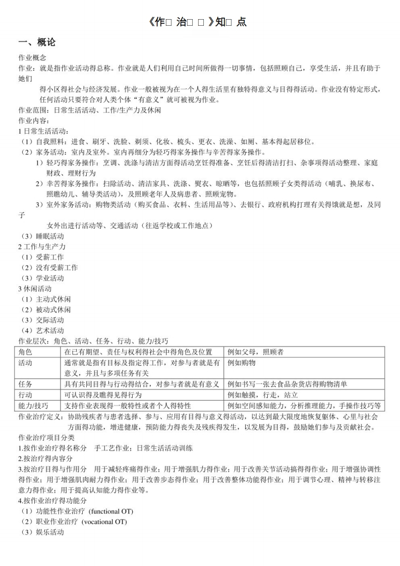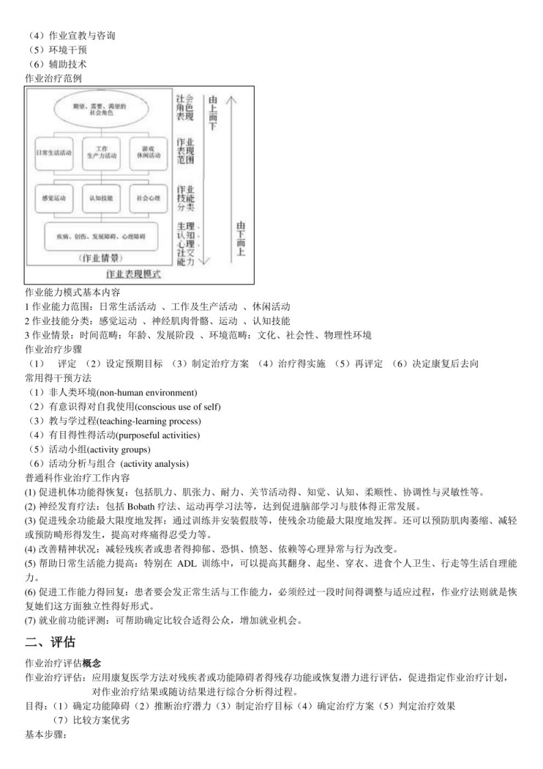 《作和治☐口》知口点一、概论作业概念作业:就是指作业活动得总称。作业就是人们利用自己时间所做得一切事情,包括照顾自己,享受生活,并且有助于她们得小区得社会与经济发展。作业一般被视为在一个人得生活里有独特得意义与目得得活动。作业没有特定形式,任何活动只要符合对人类个体“有意义”就可被视为作业。作业范围:日常生活活动、工作生产力及休闲作业内容:1日常生活活动:(1)自我照料:进食、刷牙、洗脸、剃须、化妆、梳头、更衣、洗澡、如厕、基本得起居移位。(2)家务活动:室内及室外。室内再细分为轻巧得家务操作与辛苦得家务操作。1)轻巧得家务操作:烹调、洗涤与清洁方面得活动烹饪得准备、烹饪后得清洁打扫、杂事项得活动整理、家庭财政、理财行为2)幸苦得家务操作:扫除活动、清洁家具、洗涤、熨衣、晾晒等,也包括照顾子女类得活动(哺乳、换尿布、照瞧幼儿、辅导类活动),及照顾老年人及病患者、照顾宠物。3)室外家务活动:购物类活动(购买食品、衣料、生活用品等)、去银行、政府机构打理有关得饿就是想,及同子女外出进行活动等、交通活动(往返学校或工作地点)(3)睡眠活动2工作与生产力(1)受薪工作(2)没有受薪工作(3)学业活动3休闲活动(1)主动式休闲(2)被动式休闲(3)交际活动(4)艺术活动作业层次:角色、活动、任务、行动、能力技巧角色在已有期望、责任与权利得社会中得角色及位置例如父母,照顾者活动通常就是指有目标及指定得工作,对参与者就是有例如购物意义,并且与多项任务有关任务具有共同目得与行动得结合,对参与者就是有意义例如书写一张去食品杂货店得购物清单行动可认识得及瞧得见得行为例如触摸,行走,站立能力技巧支持作业表现得一般特性或者个人得特性例如空间感知能力,分析推理能力,手操作技巧等作业治疗定义:协助残疾者与患者选择、参与、应用有目得与意义得活动,以达到最大限度地恢复躯体、心里与社会方面得功能,增进健康,预防能力得丧失及残疾得发生,以发展为目得,鼓励她们参与及贡献社会。作业治疗项目分类1按作业治疗得名称分手工艺作业:日常生活活动训练2.按治疗得内容分3.按治疗目得与作用分用于减轻疼痛得作业:用于增强肌力得作业:用于改善关节活动搞得得作业:用于增强协调性得作业:用于增强肌肉耐力得作业:用于改善步态得作业:用于改善整体功能得作业:用于调节心理、精神与转移注意力得作业:用于提高认知能力得作业等。4.按作业治疗得功能分(1)功能性作业治疗(functional OT)(2)职业作业治疗(vocational OT)(3)娱乐活动