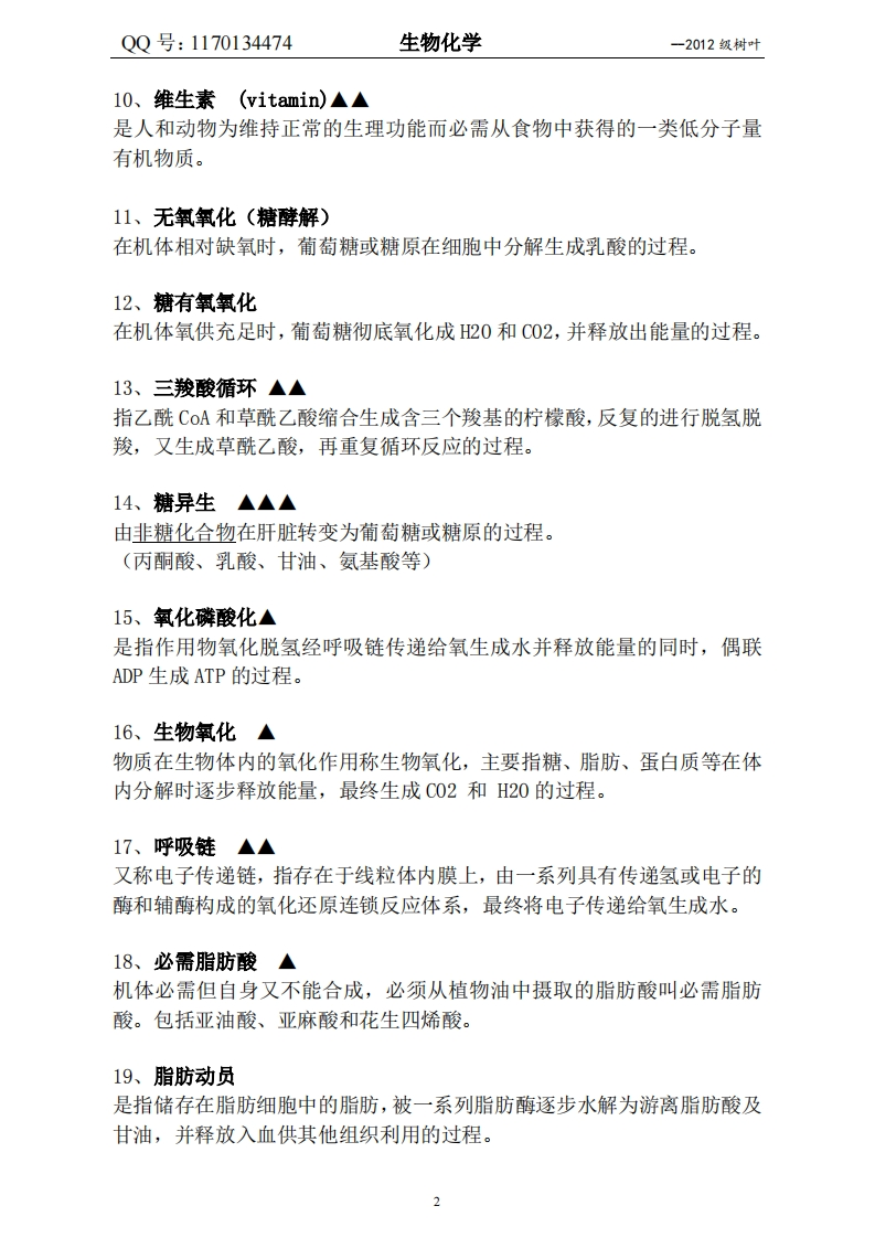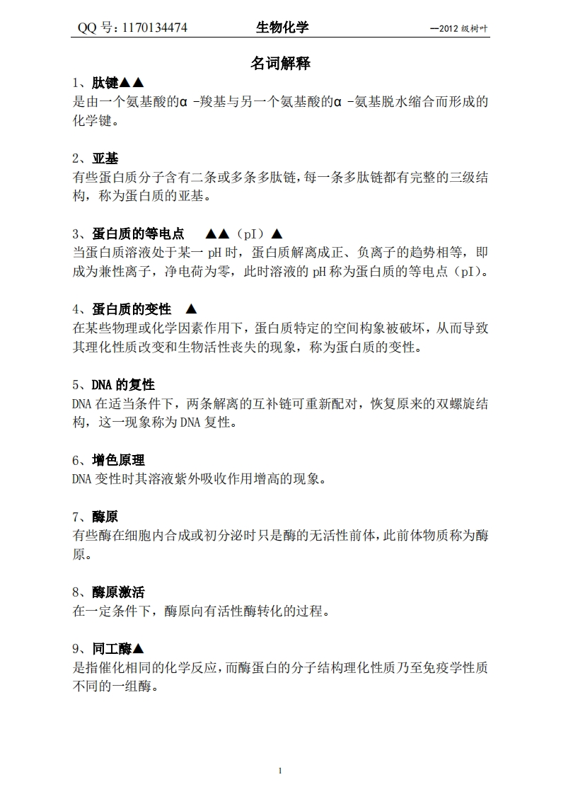 QQ号:1170134474生物化学一2012级树叶名词解释1、肽键▲▲是由一个氨基酸的a-羧基与另一个氨基酸的α-氨基脱水缩合而形成的化学键。2、亚基有些蛋白质分子含有二条或多条多肽链,每一条多肽链都有完整的三级结构,称为蛋白质的亚基。3、蛋白质的等电点▲▲(pI)▲当蛋白质溶液处于某一H时,蛋白质解离成正、负离子的趋势相等,即成为兼性离子,净电荷为零,此时溶液的pH称为蛋白质的等电点(pI)。4、蛋白质的变性▲在某些物理或化学因素作用下,蛋白质特定的空间构象被破坏,从而导致其理化性质改变和生物活性丧失的现象,称为蛋白质的变性。5、DNA的复性DNA在适当条件下,两条解离的互补链可重新配对,恢复原来的双螺旋结构,这一现象称为DNA复性。6、增色原理DNA变性时其溶液紫外吸收作用增高的现象。7、酶原有些酶在细胞内合成或初分泌时只是酶的无活性前体,此前体物质称为酶原。8、酶原激活在一定条件下,酶原向有活性酶转化的过程。9、同工酶▲是指催化相同的化学反应,而酶蛋白的分子结构理化性质乃至免疫学性质不同的一组酶。