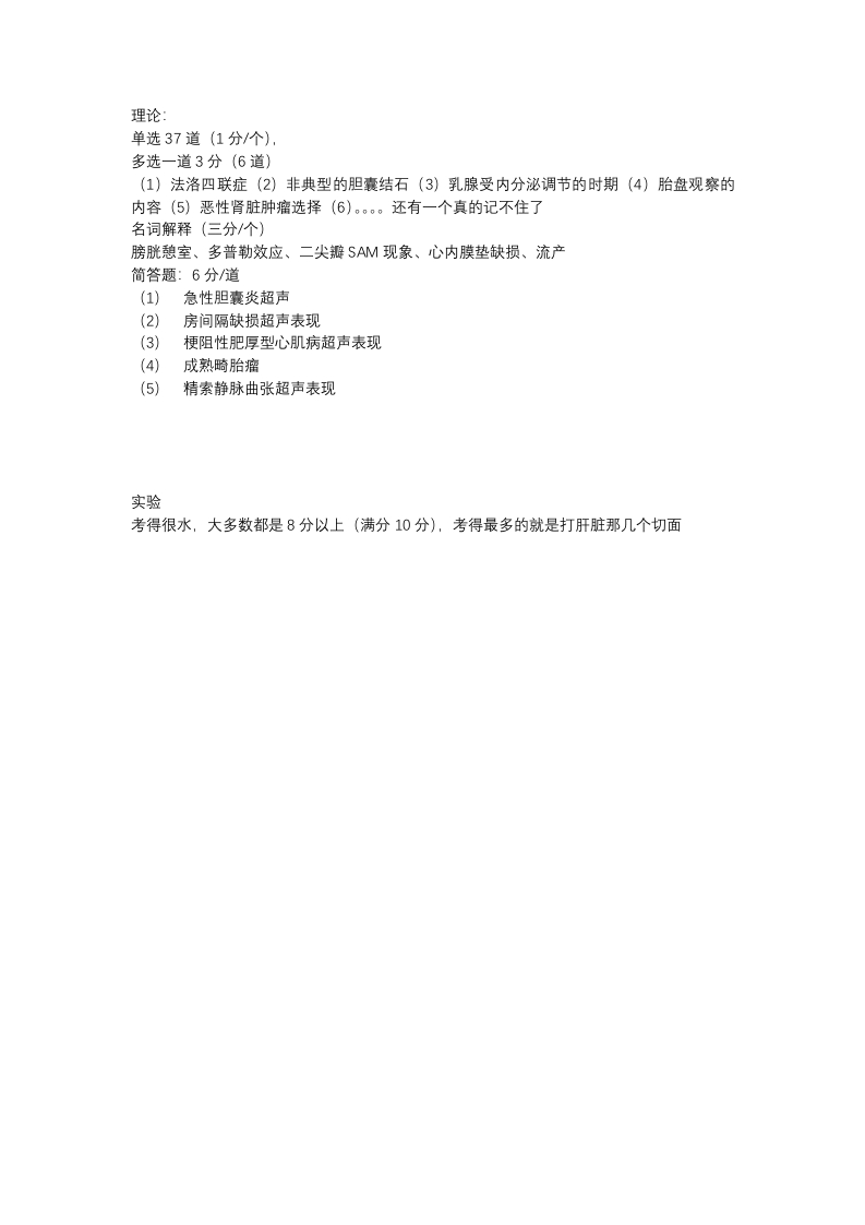 理论:单选37道(1分/个).多选一道3分(6道)(1)法洛四联症(2)非典型的胆囊结石(3)乳腺受内分泌调节的时期(4)胎盘观察的内容(5)恶性肾脏肿瘤选择(6)。。还有一个真的记不住了名词解释(三分/个)】膀胱憩室、多普勒效应、二尖瓣SAM现象、心内膜垫缺损、流产简答题:6分/道(1)急性胆囊炎超声(2)房间隔缺损超声表现(3)梗阻性肥厚型心肌病超声表现(4)成熟畸胎瘤(5)精索静脉曲张超声表现实验考得很水,大多数都是8分以上(满分10分),考得最多的就是打肝脏那几个切面