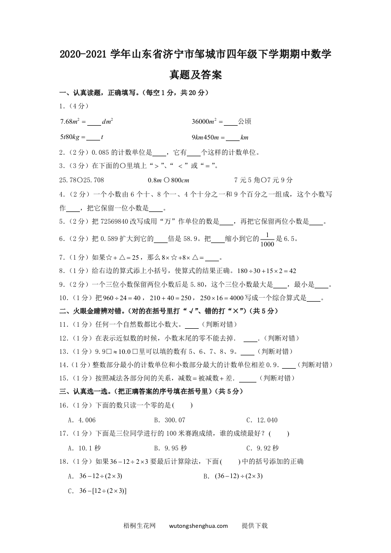 2020-2021学年山东省济宁市邹城市四年级下学期期中数学真题及答案(Word版)qweryou25年12月19日发布关注私信03718 第1页 / 共8页 该文档为免费文档,您可直接下载完整版进行阅读 © 版权声明文章版权归作者所有,转载请注明来源,未经允许请勿转载。本站内容均来自用户投稿或网络公开收集,本站只做展示,不对内容真实性负责。THE END考试考证 喜欢就支持一下吧点赞8 分享QQ空间微博QQ好友海报分享复制链接收藏